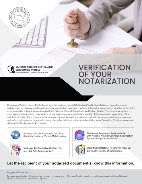 To become a registered Agent and to subscribe to the National Notarial Centralized Verification System, visit the company’s website at www.CentralizedVerification.com